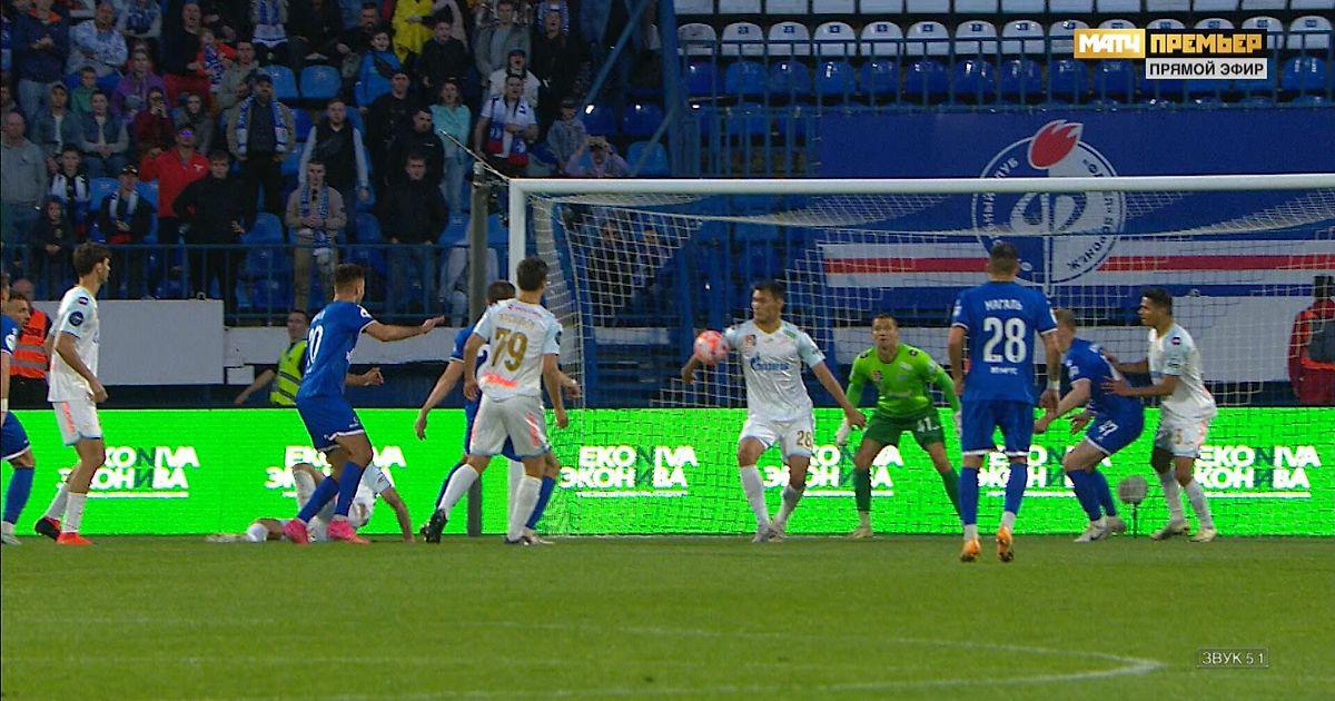 На 8-й добавленной минуте защитник гостей Нуралы Алип сыграл рукой в своей штрафной площади после навеса. Главный судья Алексей Сухой, проконсультировавшись с видеоассистентом и ознакомившись с повтором, назначил пенальти в ворота «Зенита».