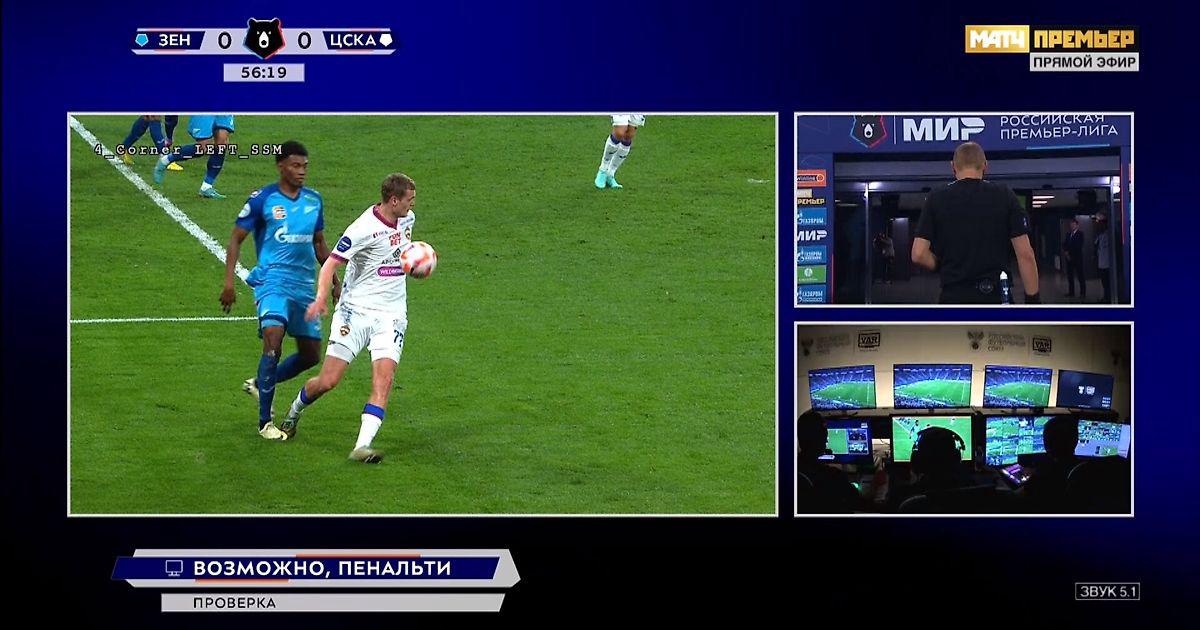Главный судья Сергей Иванов, проконсультировавшись с видеоассистентом и изучив повтор, назначил одиннадцатиметровый.