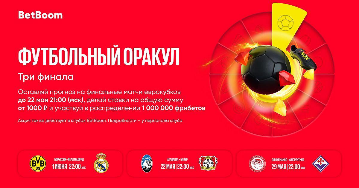BetBoom начинает розыгрыш 1 000 000 фрибетов среди всех клиентов! Участвуй в акции онлайн или приходи смотреть финалы в клубы BetBoom, делай ставку и претендуй на бесплатный миллион.