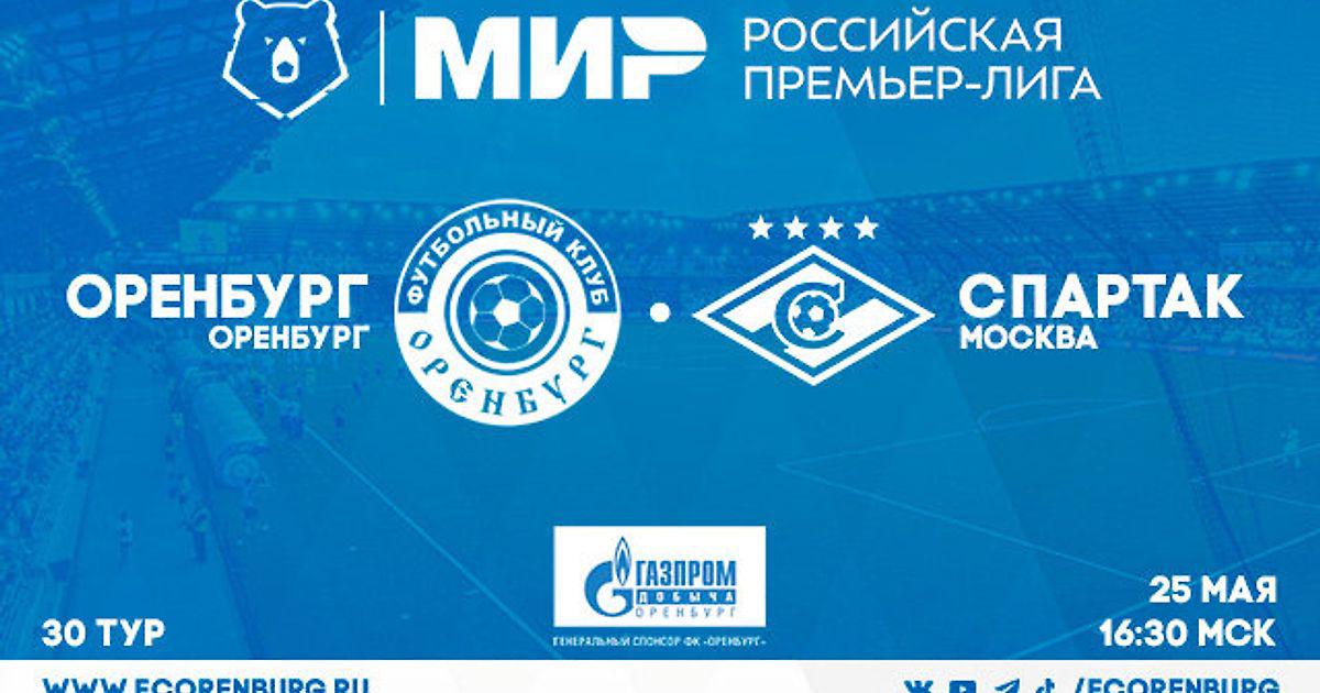 В 30 туре Мир РПЛ «Оренбург» сыграет против «Спартака». Матч пройдет в субботу, 25 мая, в 18:320 по местному времени на стадионе «Газовик».