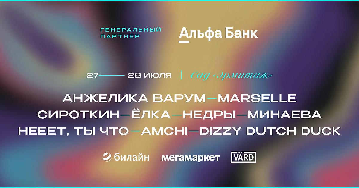 На главной сцене фестиваля – Alfa Stage, выступят Анжелика Варум, Marselle, Сироткин, Елка, Недры, «нееет, ты что», Минаева, Amchi, Dizzy Dutch Duck.