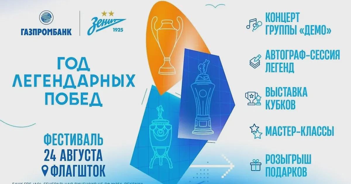 24 августа в общественном пространстве «Флагшток» пройдет масштабный фестиваль «Зенита» и Газпромбанка, посвященный юбилеям знаковых трофеев сине-бело-голубых.