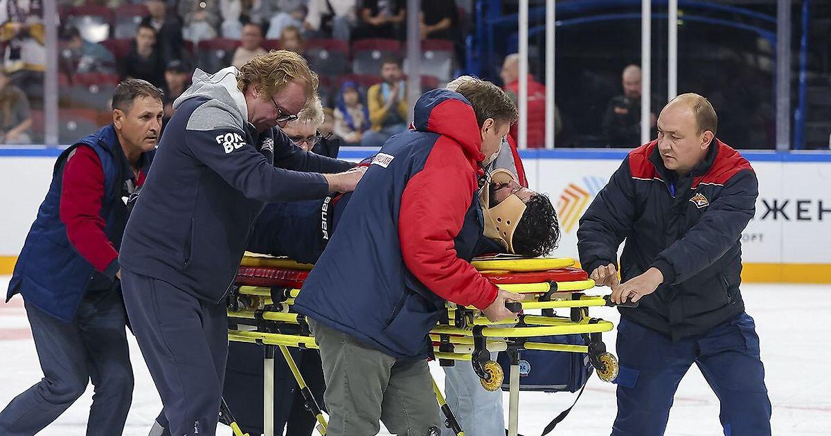 Нападающий «Металлурга» получил травму, его унесли на носилках с фиксирующим устройством на шее.