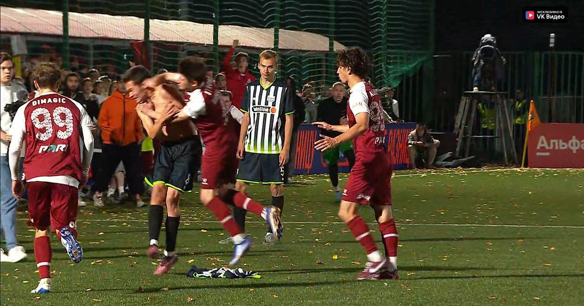 Потасовка началась с того, что Володя XXL после фола в центре поля снял с себя футболку и предложил ее Глебу Алексееву. Хавбек «Банки» взял майку форварда «РМ», бросил на газон и начал топтать.