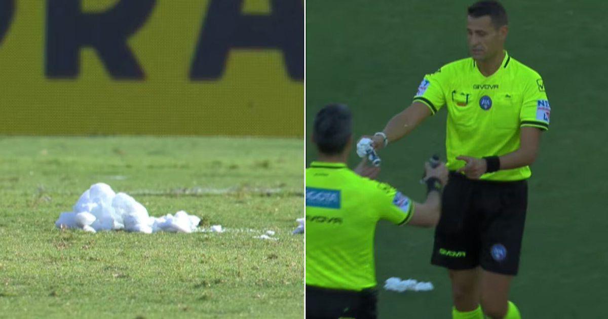 У судьи взорвался баллончик с исчезающим спреем на матче Кубка Италии, покрыв участок поля пеной