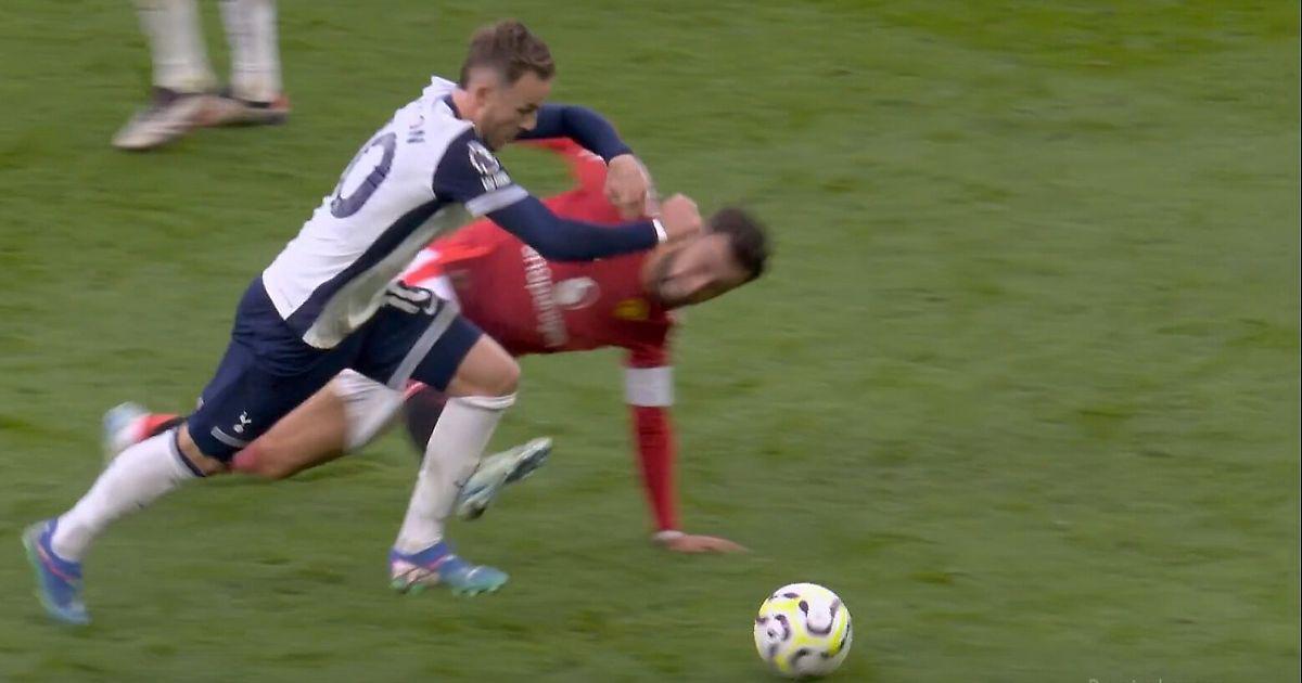 Бруну удален за удар в голень Мэддисону в падении. Хавбек «МЮ», вероятно, поскользнулся