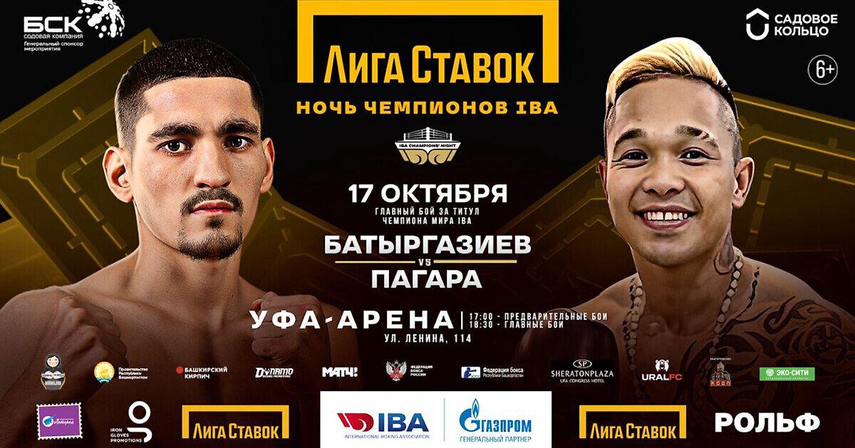 17 октября в Уфе прошел боксерский турнир «Лига Ставок. Ночь чемпионов IBA». В главном событии Альберт Батыргазиев (12-0) подрался за пояс IBA во втором полулегком весе с филиппинцем Альбертом Пагарой (35-2).