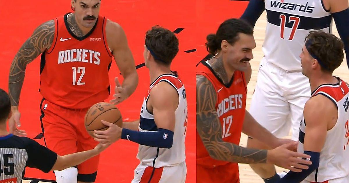 В паузе матча против «Хьюстона» игрок «Вашигтона» не хотел отдавать мяч судье, но тут на него побежал центровой техасцев Стивен Адамс.