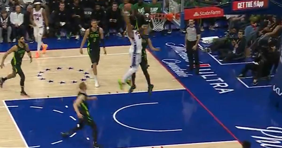 Бигмен «Филадельфии» поставил сверху через защитника «Бостона» Деррика Уайта.