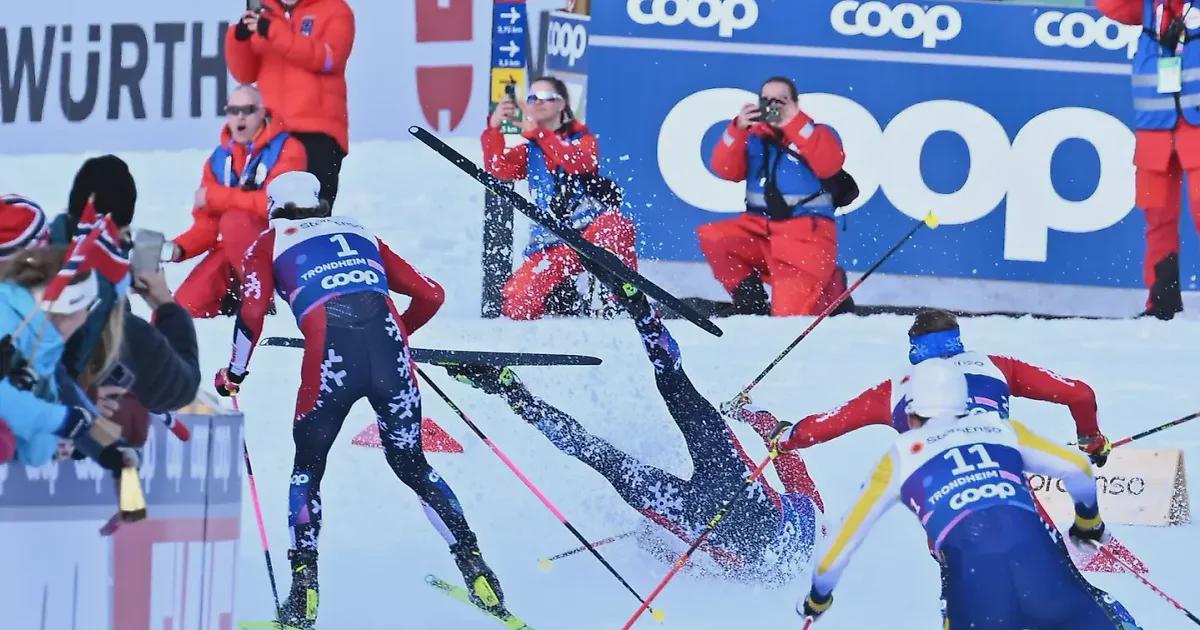 Норвежец шел в лидирующей группе на протяжении всей гонки, но за 2 км до финиша попытался оторваться, упал и сломал лыжи.