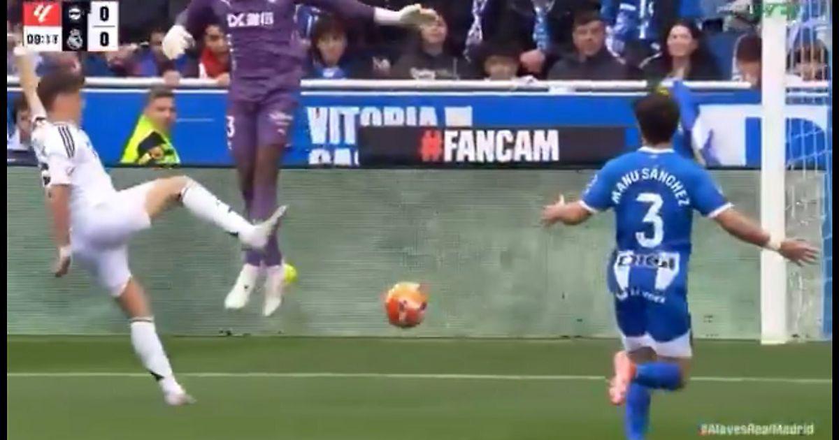 На 9-й минуте матча 31-го тура Ла Лиги хавбек «Реала» выскочил один на один с вратарем Хесусом Овоно, но не смог попасть по скачущему мячу.