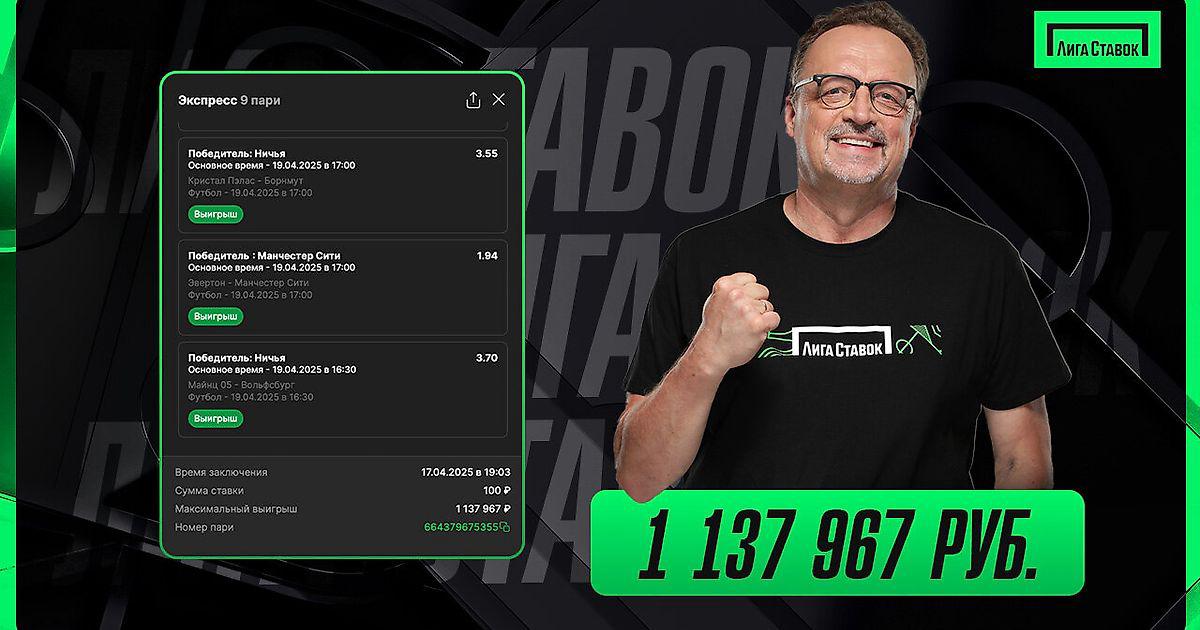Россиянин выиграл более 1,1 млн со ставки в 100 рублей. Он собрал экспресс с коэффициентом 11 379.00