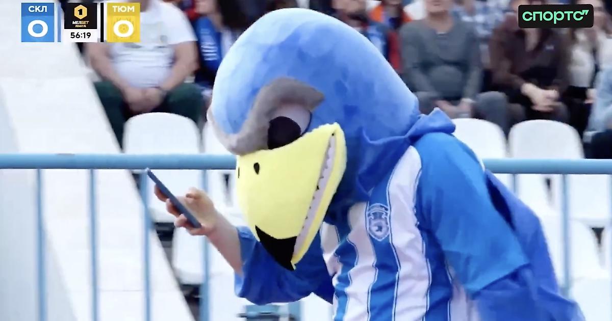 Маскот «Сокола» достал телефон во время матча с «Тюменью». Он остановился и что-то смотрел на экране
