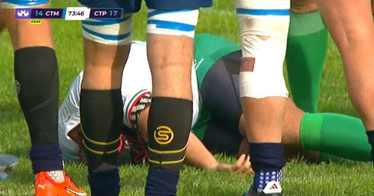 После схватки Бурдин остался лежать на поле без движения. Его уложили на носилки и увезли на скорой.