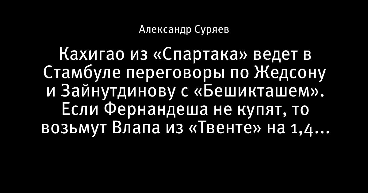 Кахигао из «Спартака» ведет в Стамбуле переговоры по Жедсону и Зайнутдинову с «Бешикташем». Если Фернандеша не купят, то возьмут Влапа из «Твенте» на 1,4 млн евро в год (Иван Карпов)