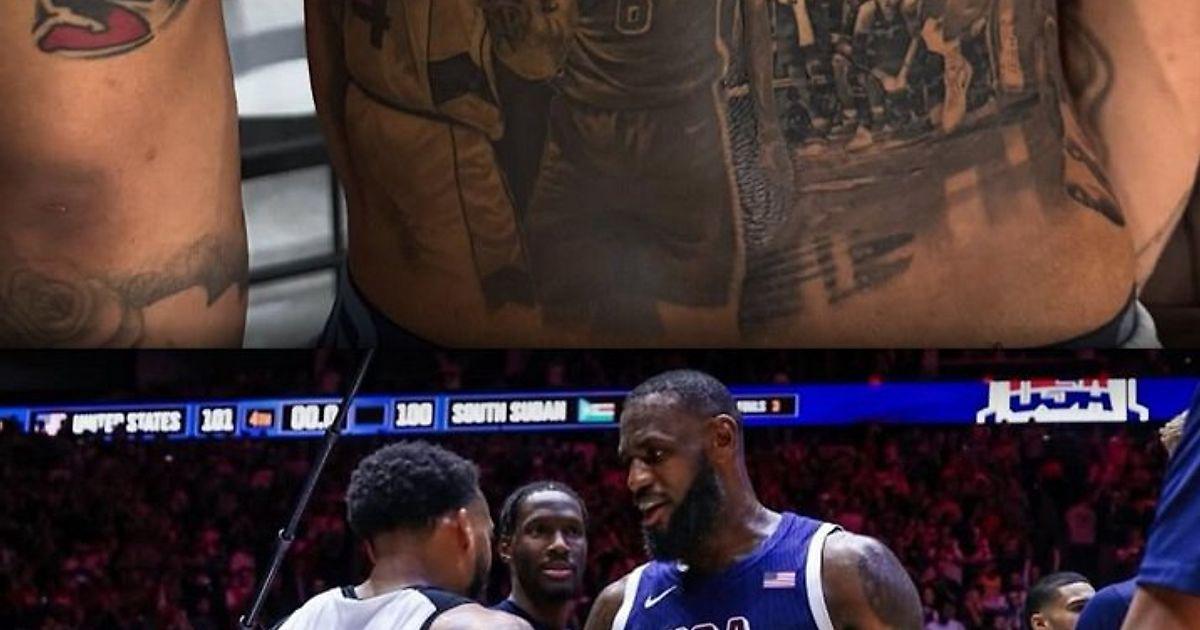 Изображение на спине разыгрывающего сборной Южного Судана повторяет сцену рукопожатия с Леброном Джеймсом во время олимпийского баскетбольного турнира во Франции.