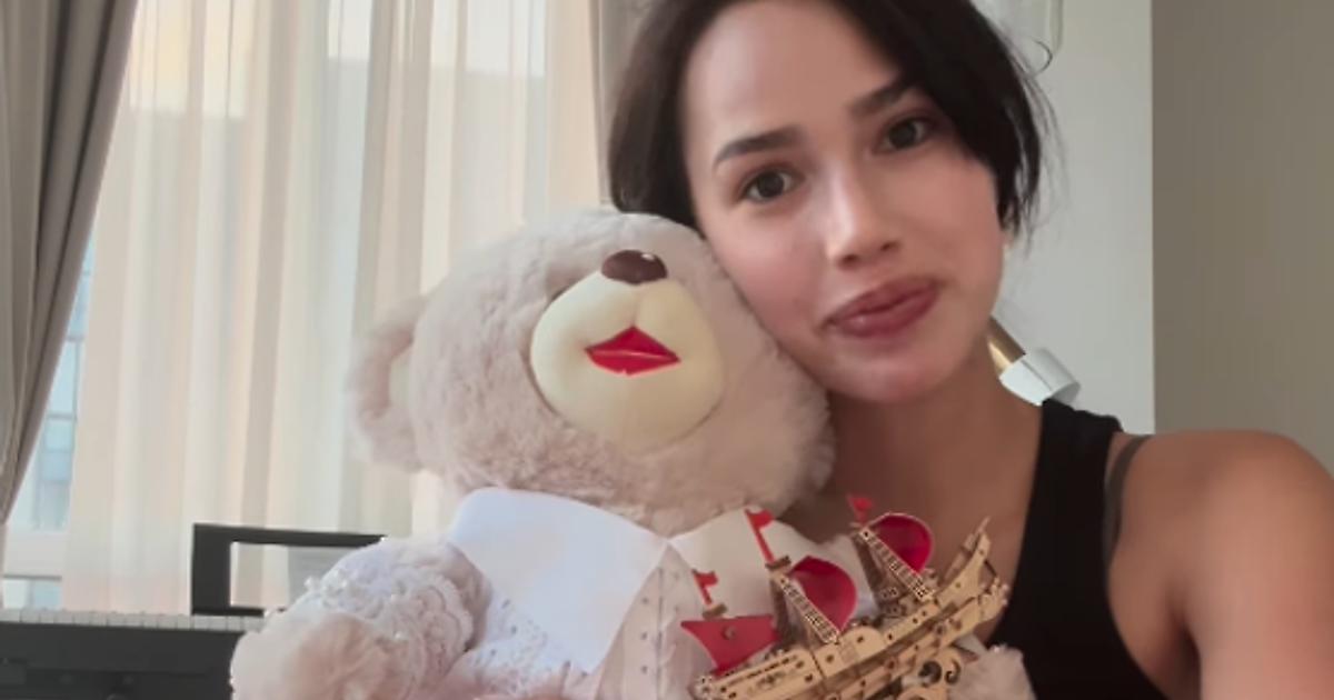 Алина Загитова показала игрушечного медведя, подаренного ей Яной Рудковской.