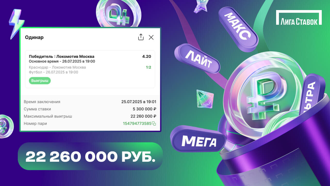 26 июля прошел центральный матч 2-го тура РПЛ между «Краснодаром» и «Локомотивом». Клиент «Лиги Ставок» заключил одинар на победу «Локо» за коэффициент 4,20. Сумма ставки — 5 300 000 рублей, а итоговый выигрыш составил 22 260 000 рублей.
