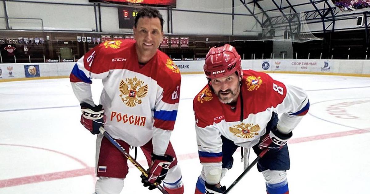 На фотографии член совета директоров «Динамо» и форвард «Вашингтона» стоят на льду в хоккейной экипировке и форме сборной России.