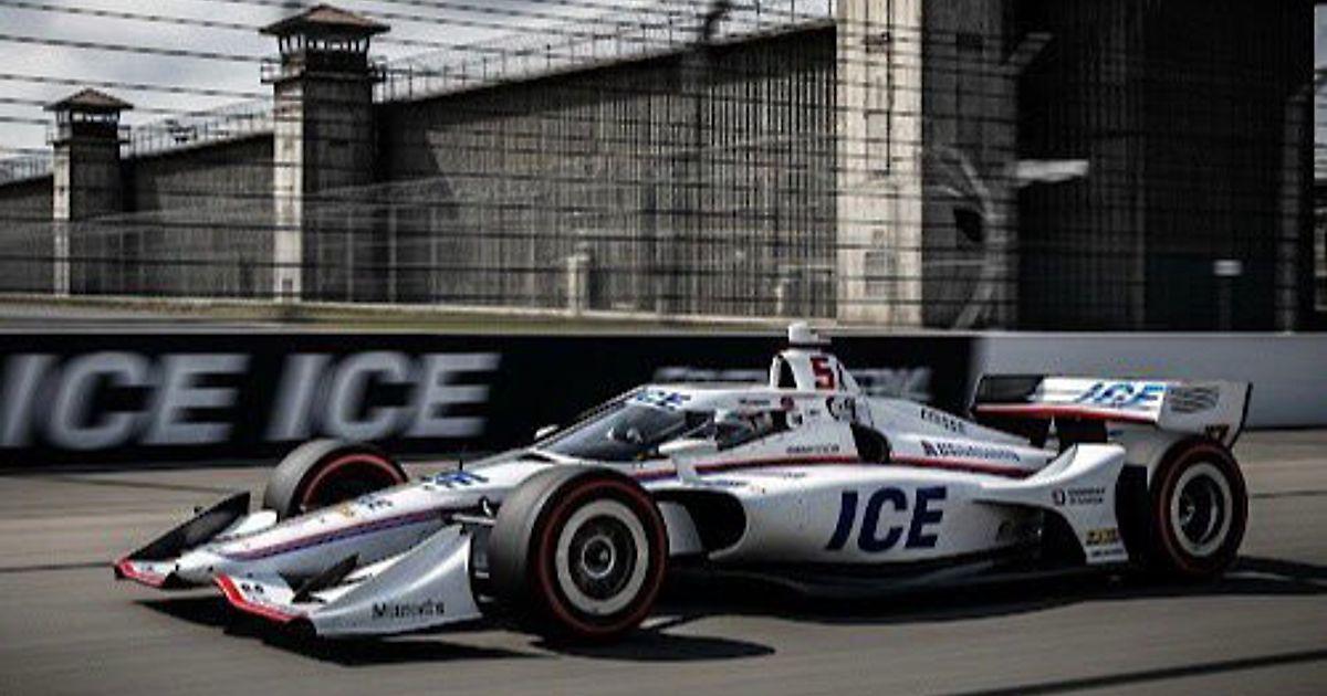 На коллаже болид «Индикара» под №5 (номер мексиканского гонщика «Эрроу Макларен» Пато О’Уорда) в цветах ICE, иммиграционной и таможенной полиции, едет по трассе на фоне тюрьмы.