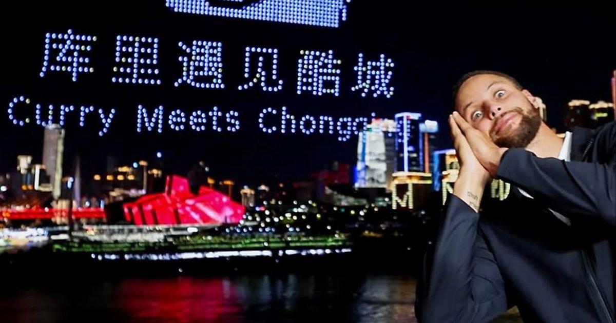 В китайском городе Чунцин для Стефена Карри устроили шоу дронов: беспилотники выстроились в изображение разыгрывающего с жестом «спокойной ночи».