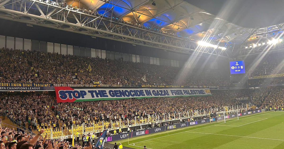 «Остановите геноцид в Газе! Свободу Палестине!» Фанаты «Фенербахче» вывесили антиизраильский баннер на матче с «Бенфикой»