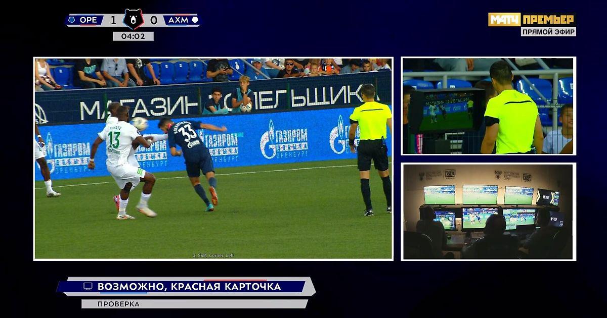 Главный судья Владислав Целовальников сперва показал футболисту грозненцев желтую карточку, но после просмотра повтора решил удалить его.