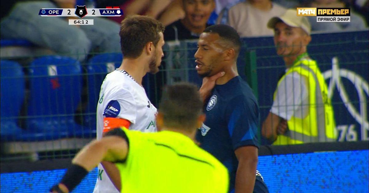 «Ахмат» остался вдевятером на 63-й минуте игры с «Оренбургом» – Садулаев схватил Муфи за горло и получил красную. На 5-й минуте за удар шипами в шею сопернику удалили Касинтуру