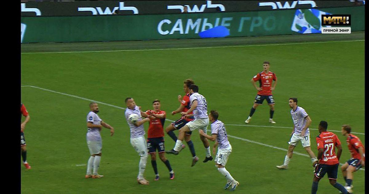 ЦСКА подал угловой в начале второго тайма, защитник армейцев Матвей Лукин нанес удар головой. Мяч попал в руку Артему Дзюбе в штрафной «Акрона».