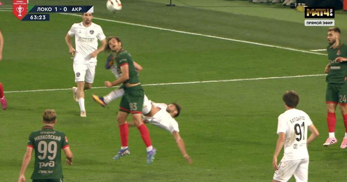 На 63-й минуте матча FONBET Кубка России полузащитник «Акрона» попытался пробить по мячу ударом через себя, но попал бутсой в лицо хавбеку «Локомотива» Артему Карпукасу.