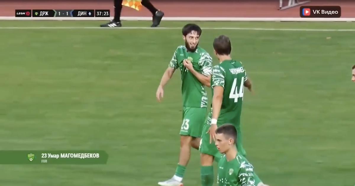 Защитник «Дружбы» Магомедбеков дальним ударом сравнял счет против «Динамо-2 Махачкала». Это первый гол в карьере футболиста