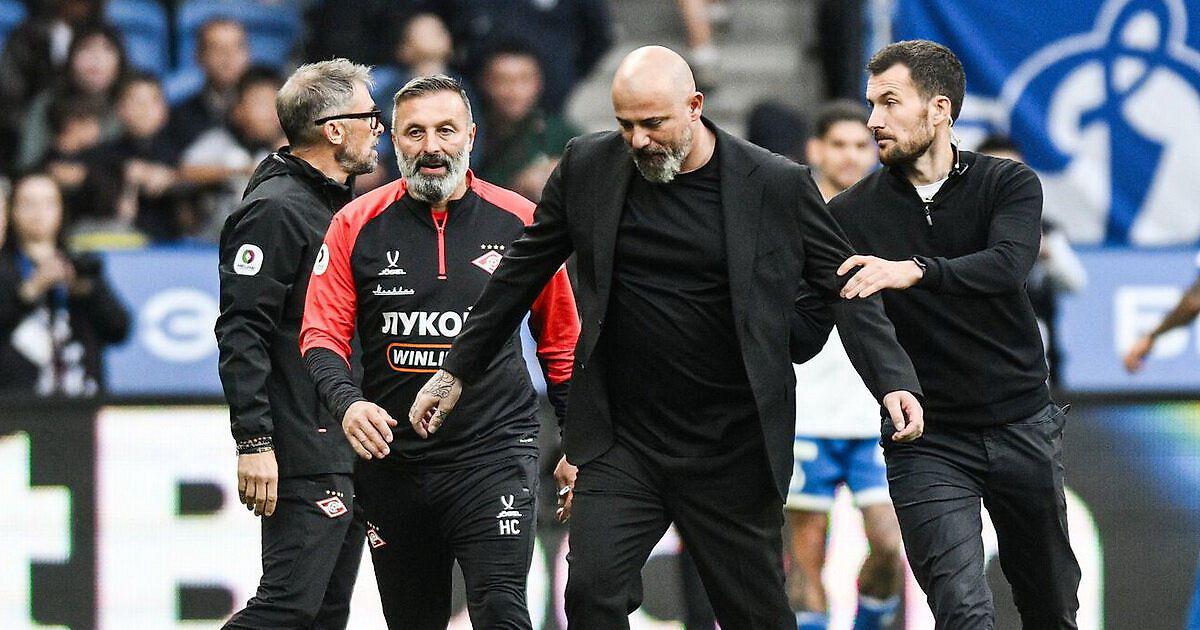 Главный тренер «Спартака» получил красную карточку после второго гола «Динамо», который забил Бителло на 3-й добавленной к первому тайму минуте. Результативная атака бело-голубых началась с того, что игрок красно-белых Маркиньос Коста упал у штрафной площади соперника в результате борьбы с защитником Хуаном Касересом. Во время атаки бразилец лежал на газоне, судья Егор Егоров нарушения правил не усмотрел.