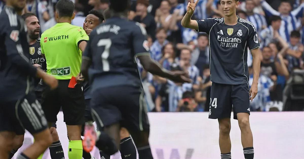 Сегодня мадридский клуб обыграл «Реал Сосьедад» со счетом 2:1 в 4-м туре Ла Лиги. На 32-й минуте защитник «сливочных» Дин Хейсен сорвал контратаку соперника, сбив возле центра поля Микеля Ойарсабаля, и получил прямую красную карточку.