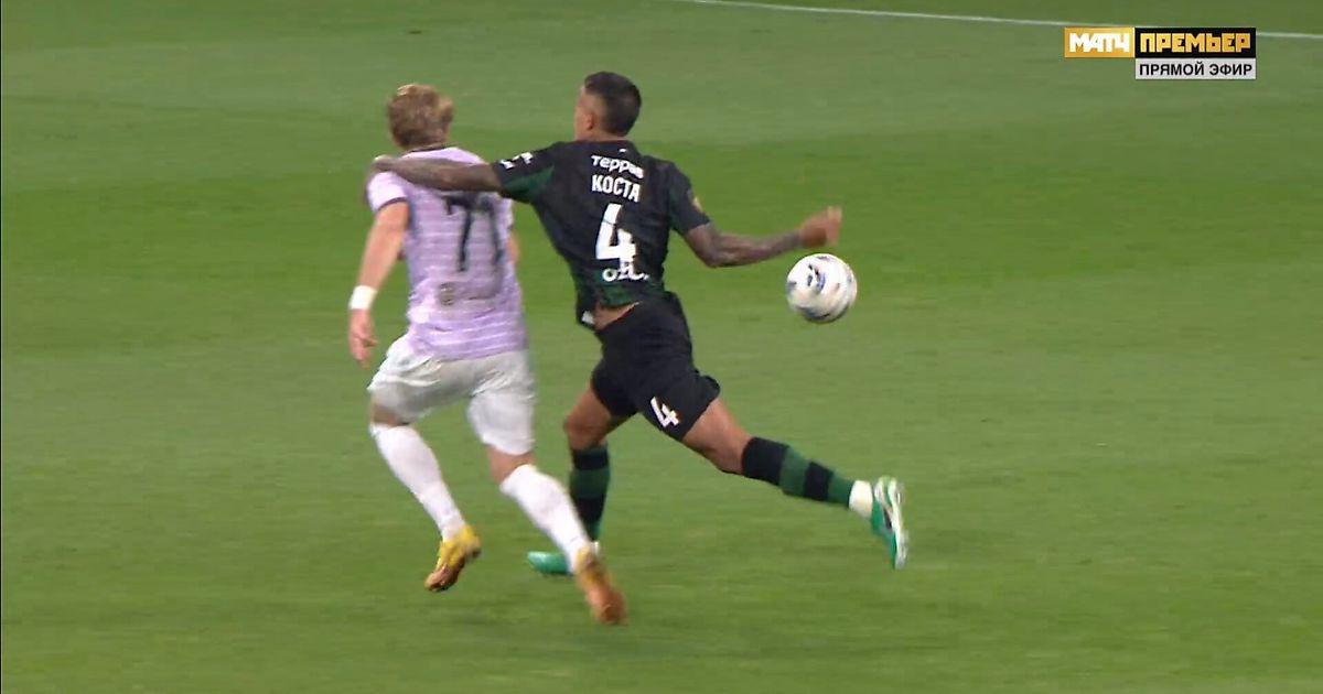 На 83-й минуте защитник «быков» Диего Энрике Коста схватил за плечо Дмитрия Пестрякова и помешал тому убежать к воротам.
