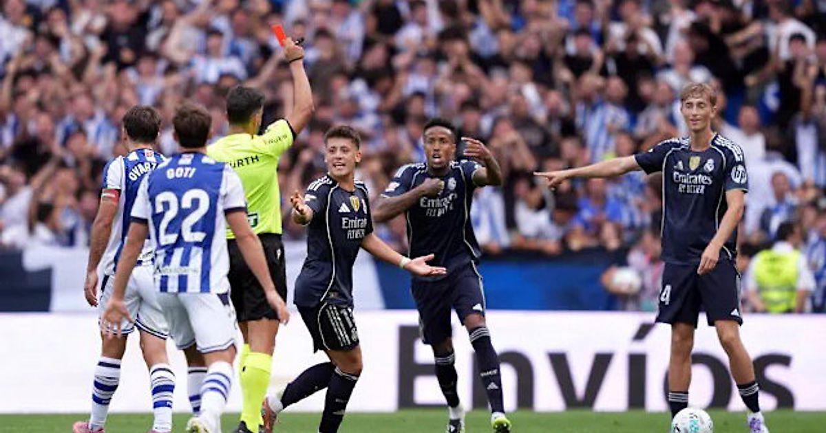 Главный судья Хесус Хиль Мансано показал защитнику «Реала» красную карточку на 32-й минуте игры с «Сосьедадом» (2:1) в 4-м туре Ла Лиги.
