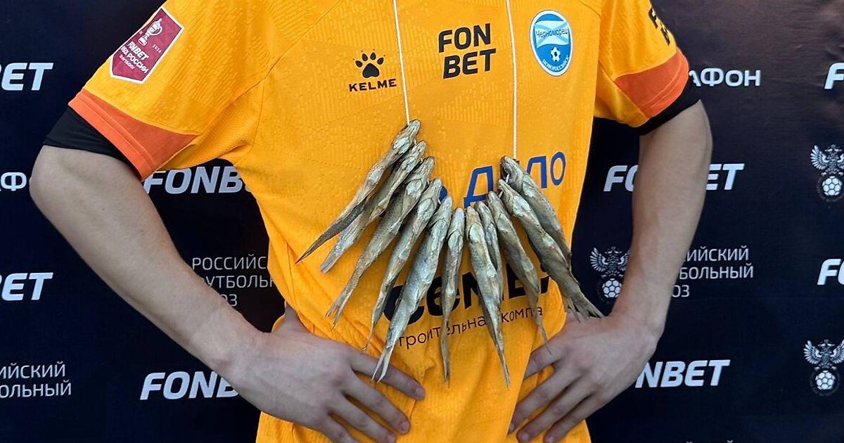 «Астрахань» подарила игроку «Черноморца» связку воблы.