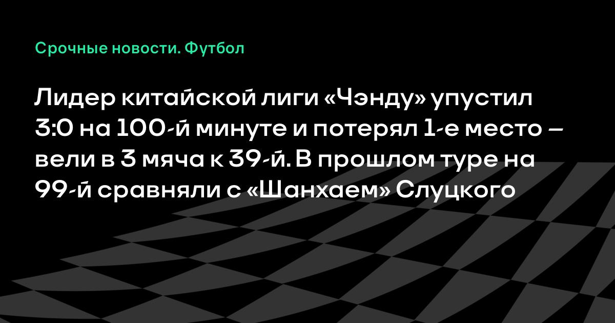 Лидер китайской лиги «Чэнду» упустил 3:0 на 100-й минуте и потерял 1-е место – вели в 3 мяча к 39-й. В прошлом туре на 99-й сравняли с «Шанхаем» Слуцкого