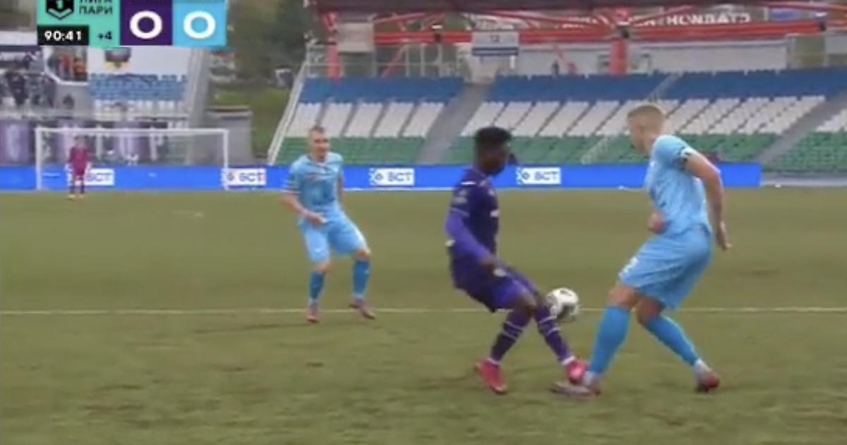 Судья не поставил пенальти в ворота «Уфы» на 1-й добавленной минуте за фол на игроке «Челябинска». Чимези попал по голеностопу Жирову