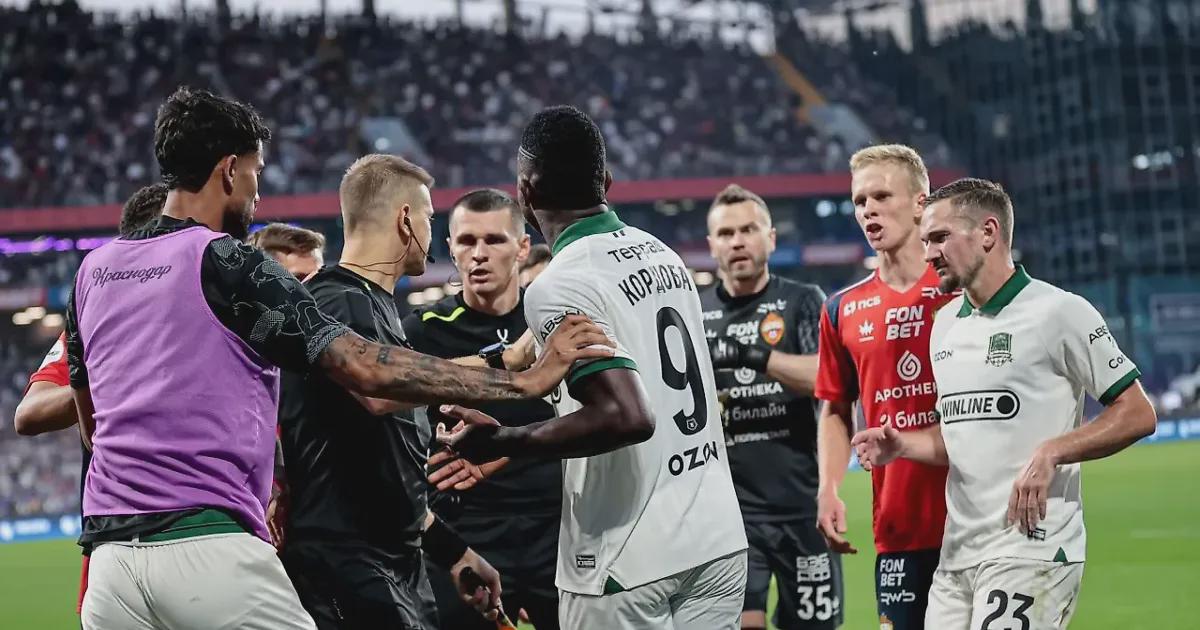 Форвард «Краснодара» был удален во втором тайме матча 7-го тура Мир РПЛ (1:1). Арбитр Рафаэль Шафеев показал Кордобе красную карточку за то, что он пнул мячом защитника армейцев Мойзеса Барбозу и зацепил шипами его руку.