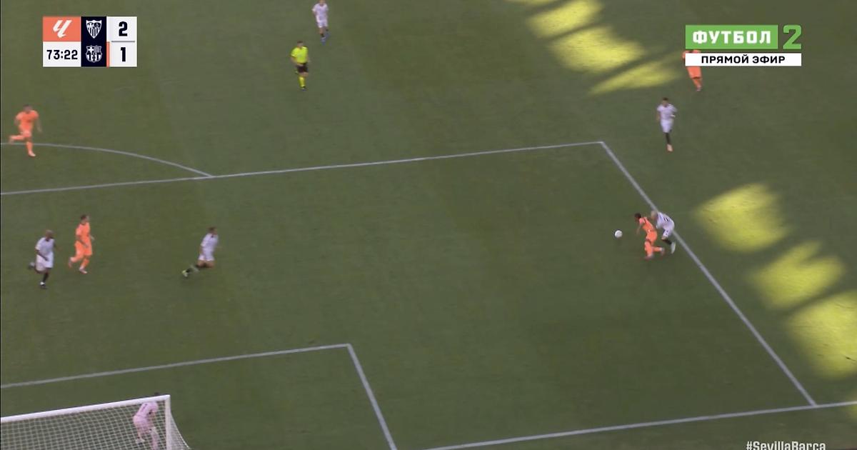 На 73-й минуте защитник каталонцев Алекс Бальде после прорыва по флангу был свален игроком «Севильи» Аднаном Янузаем с ног в штрафной.