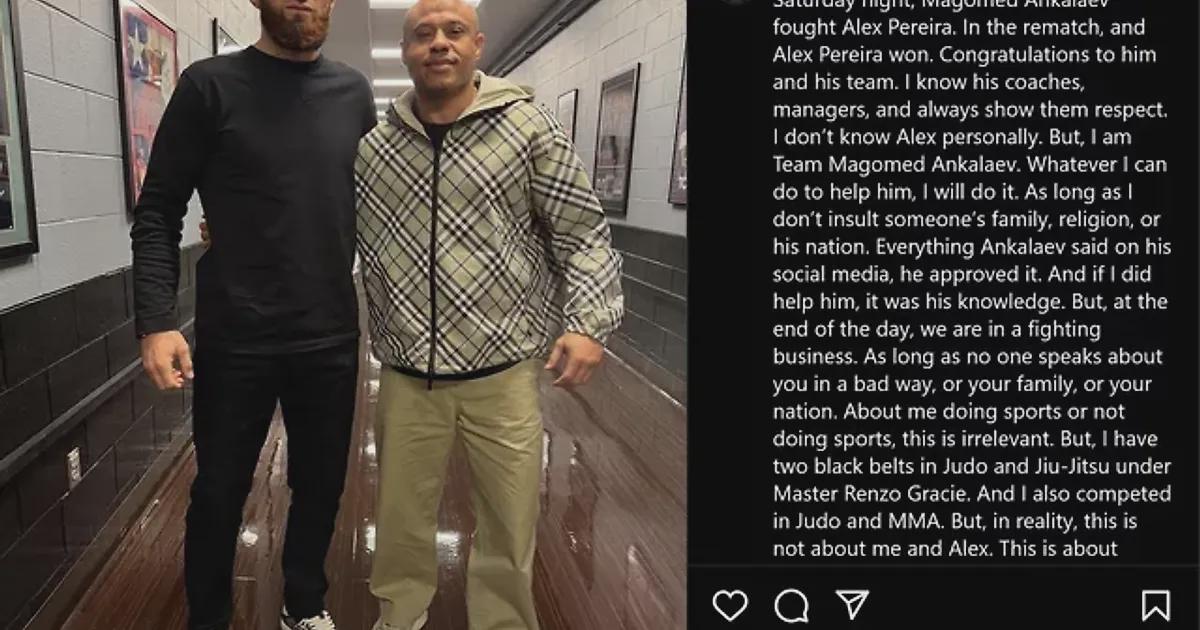Я состою в команде Магомеда Анкалаева и делаю все, чтобы ему помочь. Пока я не оскорблял чью-либо семью, религию или нацию. Анкалаев одобрил все, что было в его соцсетях. Я использовал его мысли. В конце концов, мы в бойцовском бизнесе – пока никто не говорит о тебе плохо, или твоей семье, или твоей нации.
