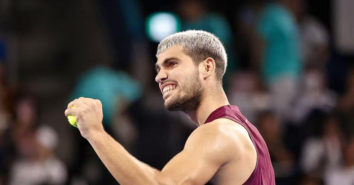 Карлос Алькарас презентует свой логотип, созданный Nike, на итоговом турнире ATP.