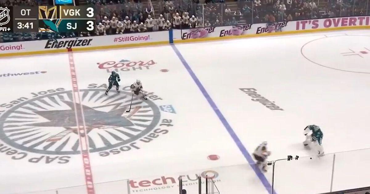 На 62-й минуте матча НХЛ с «Голден Найтс» (3:4 ОТ) вратарь «Сан-Хосе» выкатился из ворот на подбор к своей синей линии, но допустил ошибку.