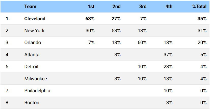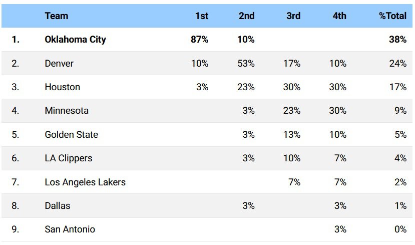 Лидерами, по результатам опроса руководителей клубов, стали победители прошлой «регулярки» – «Оклахома» и «Кливленд». Вторые места достались «Денверу» и «Нью-Йорку».
