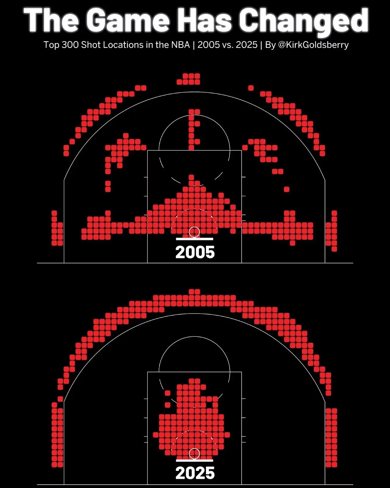 Аналитик Кирк Голдсберри проиллюстрировал отказ от средних бросков через 300 основных атакующих позиций в 2005 и 2025 годах.