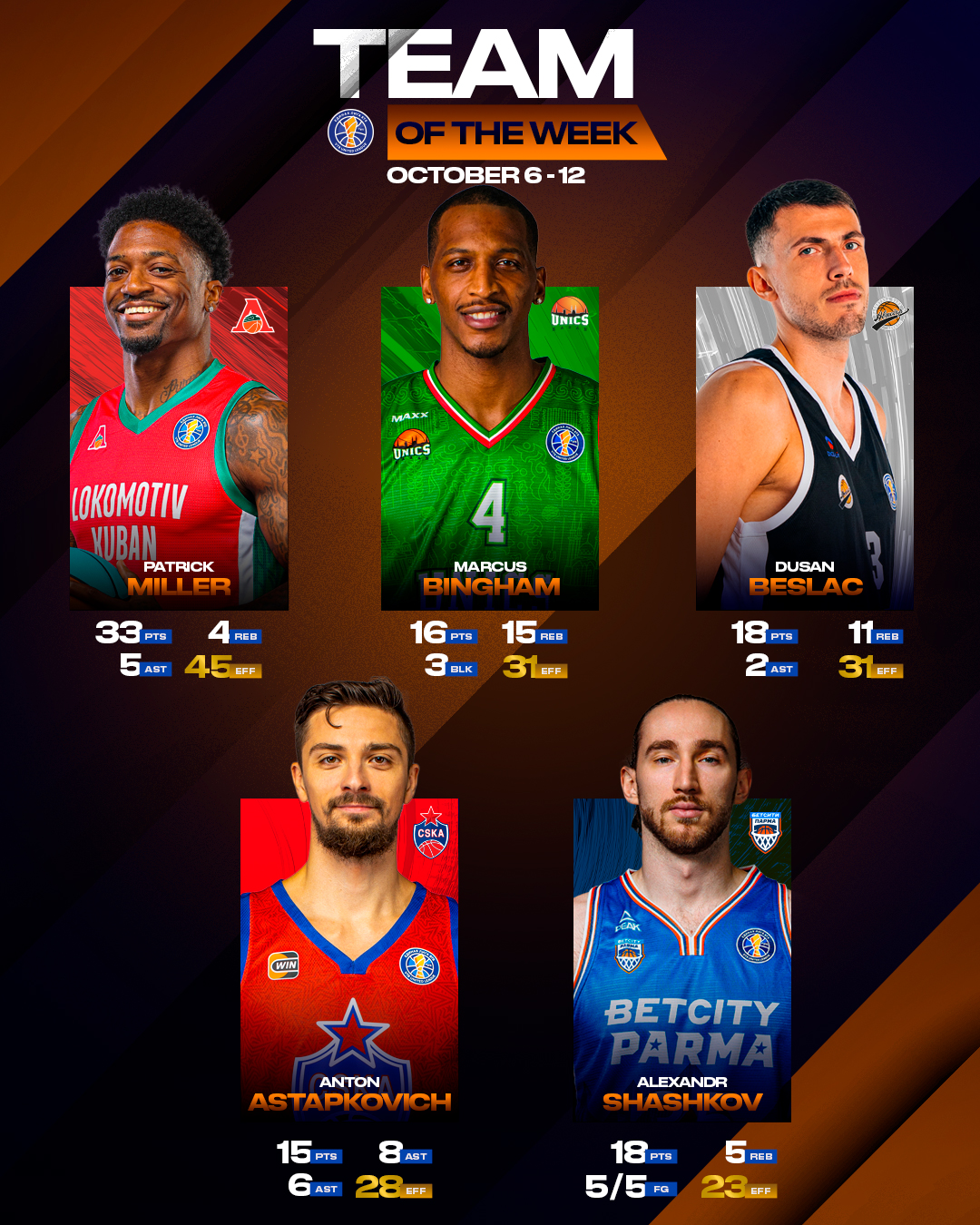 По итогам матчей 6-12 октября в нее вошли разыгрывающий Патрик Миллер («Локомотив-Кубань»), форварды Маркус Бингэм (УНИКС), Душан Беслач («Автодор»), Антон Астапкович (ЦСКА) и центровой Александр Шашков («БЕТСИТИ ПАРМА»).