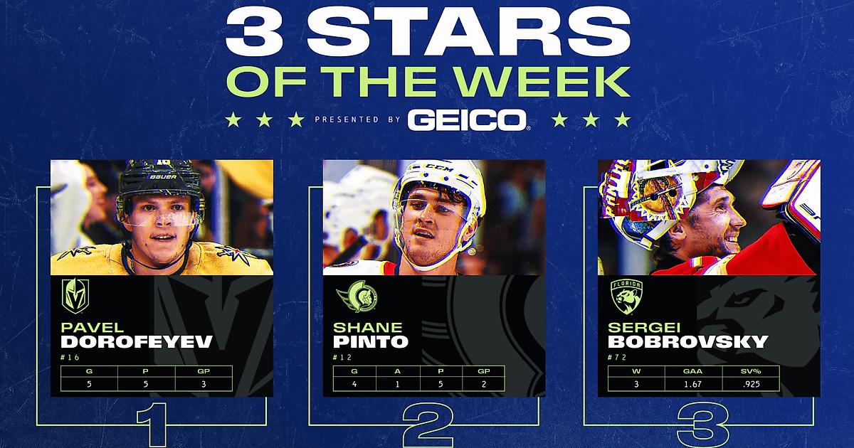 Дорофеев – 1-я звезда недели в НХЛ, у него 5 голов в 3 играх. Пинто с 4+1 в 2 матчах – 2-я, Бобровский с 3 победами – 3-я