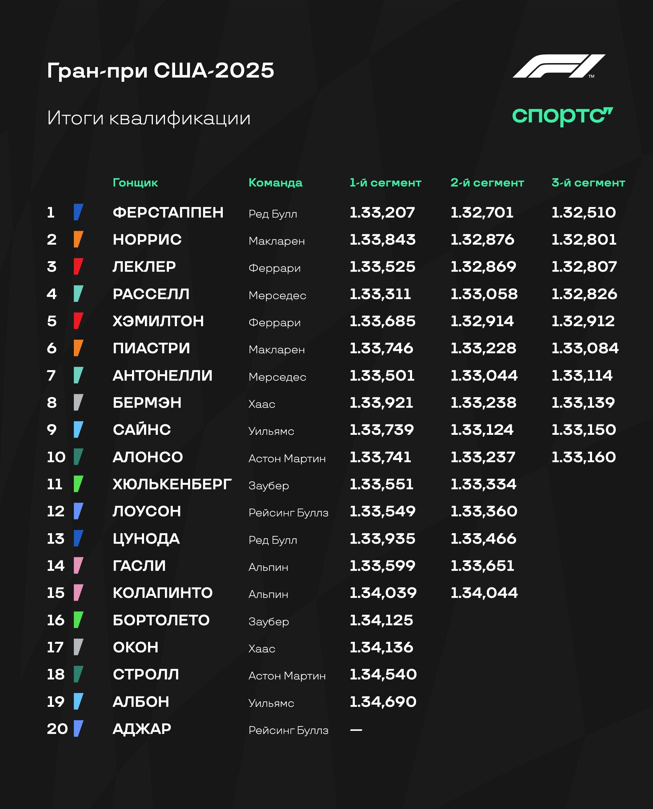 Гран-при США-2025. Ферстаппен выиграл квалификацию, Норрис – 2-й, Леклер – 3-й, Пиастри – 6-й
