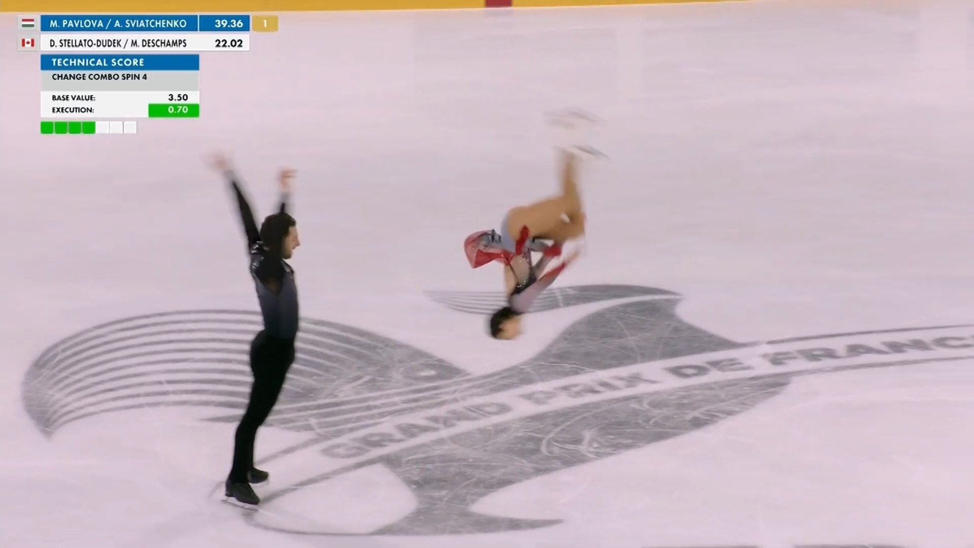 На этапе в Анже спортивная пара Стеллато-Дудек – Максим Дешам включила сальто в короткую программу, которую они исполняют под кантату «Кармина Бурана» Карла Орфа.