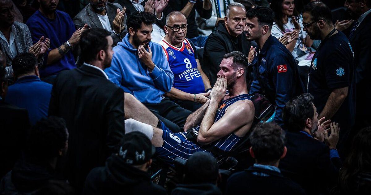 Греческий центровой неправильно приземлился после попытки аллей-упа, после чего ему была оказана помощь, и он покинул площадку на носилках со слезами на глазах.